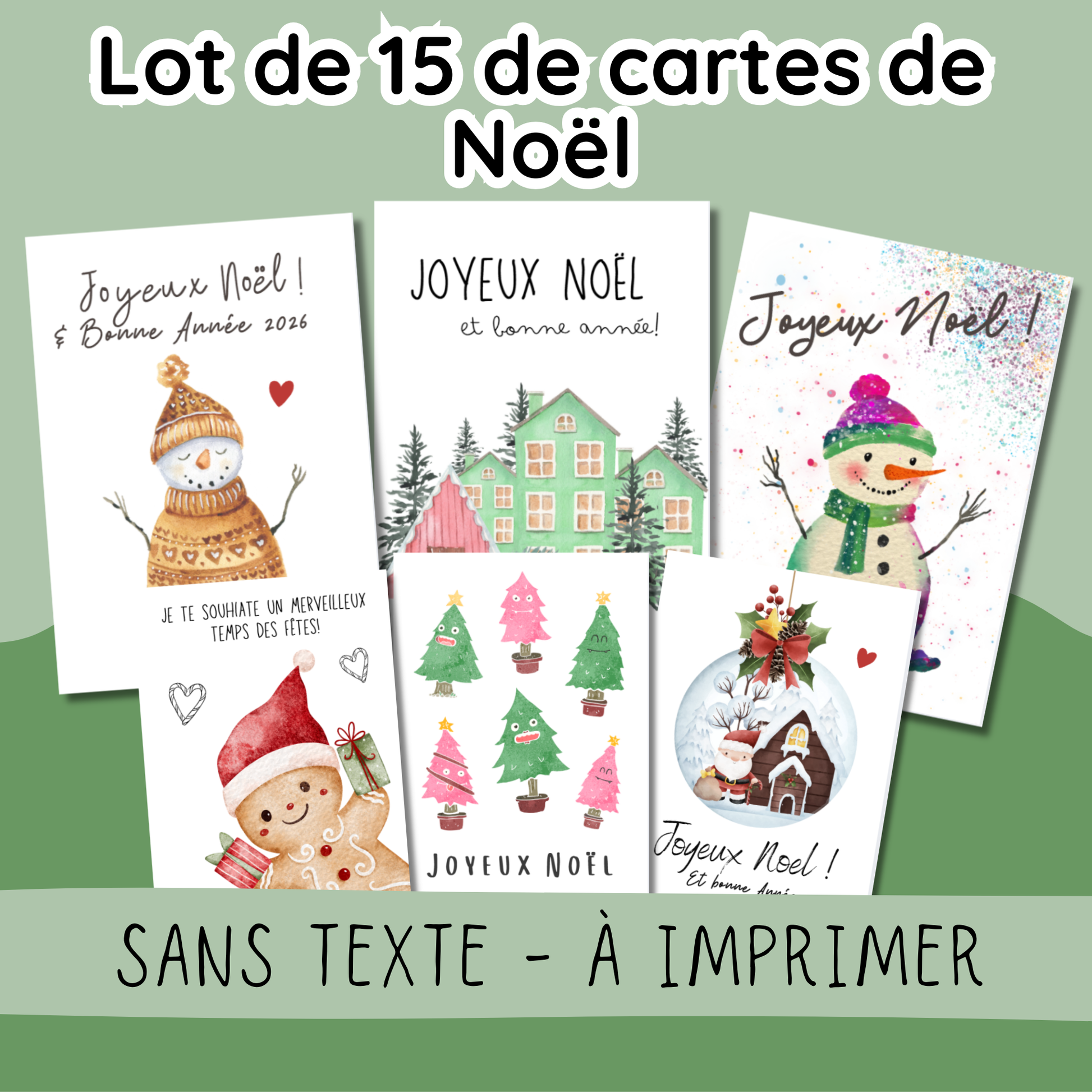 Magnifique lot de 15 cartes de Noël en français à imprimer, parfait pour offrir, accompagner vos cadeaux ou envoyer un mot chaleureux pendant le temps des fêtes.